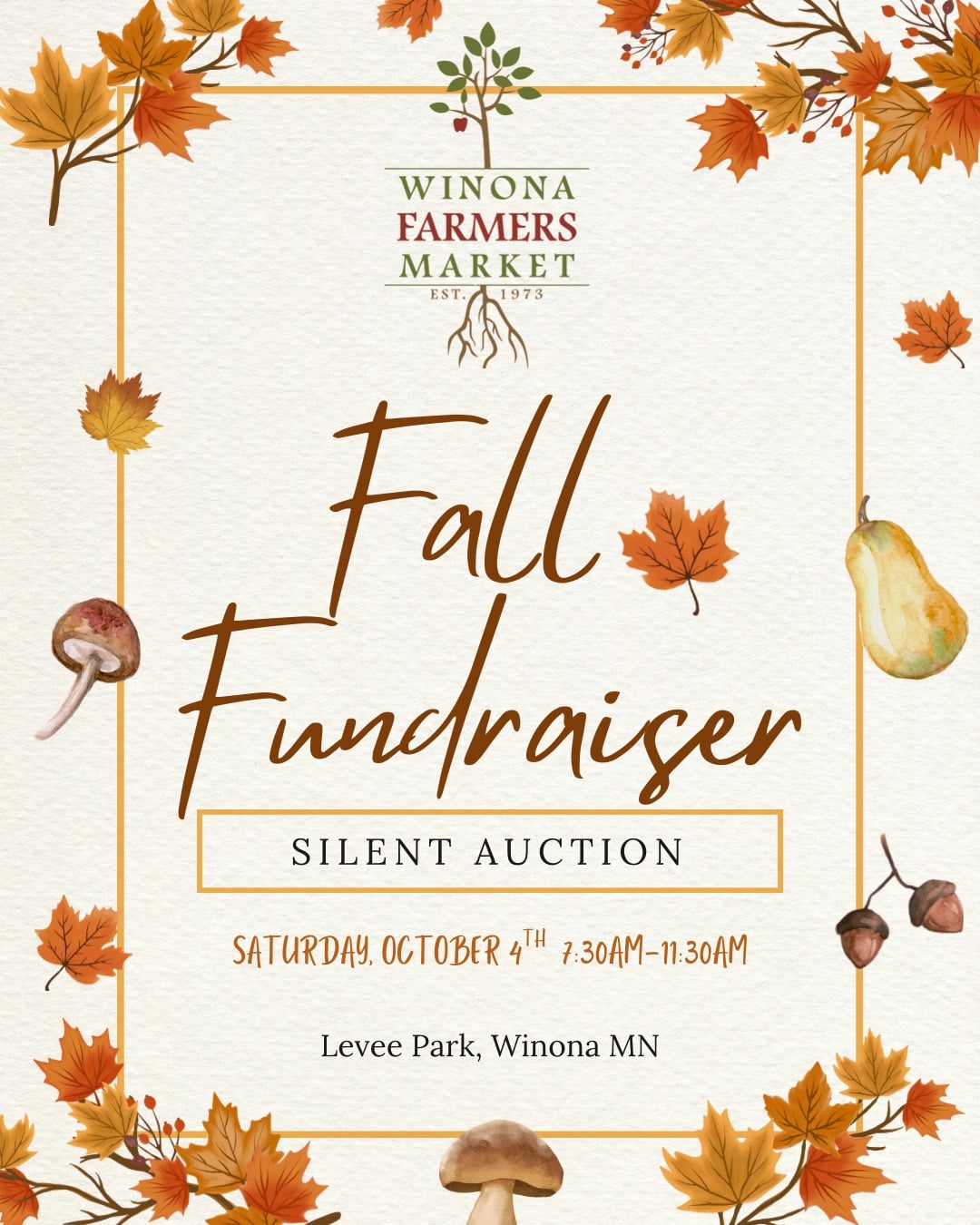 Join us Saturday, October 4th for a Fall Fundraiser to benefit the Winona Farmers Market! There will be multiple fall themed baskets with an abundance of goods from all of your favorite local vendors and some WFM swag! Stop by the auction tent, say hi to the WFM board members, place your bid and WIN!